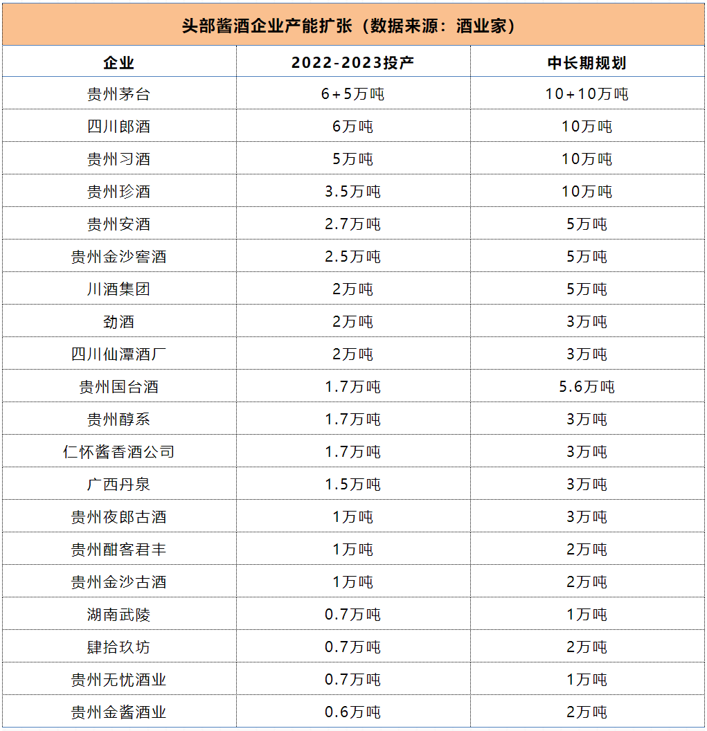 【產(chǎn)能】頭部醬酒企業(yè)產(chǎn)能軍備競(jìng)賽提速,預(yù)計(jì)到2030年之前,我國(guó)醬酒產(chǎn)業(yè)整體產(chǎn)能將會(huì)突破100萬(wàn)噸。