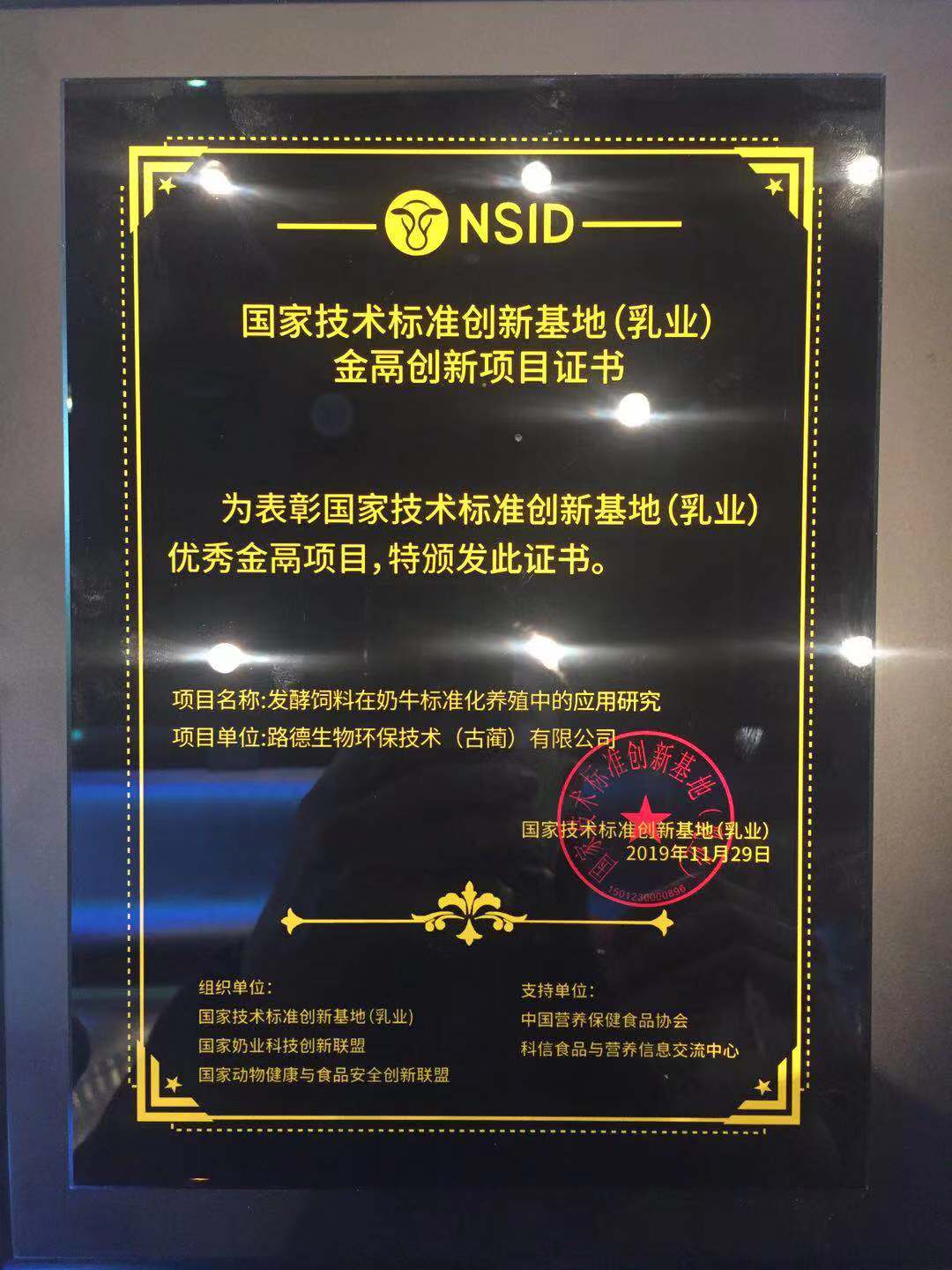 熱烈祝賀路德生物環(huán)保技術(shù)(古藺)有限公司創(chuàng)新項目“發(fā)酵飼料在奶牛標(biāo)準(zhǔn)化養(yǎng)殖中的應(yīng)用研究”榮獲國家技術(shù)標(biāo)準(zhǔn)創(chuàng)新基地(乳業(yè))金鬲創(chuàng)新項目證書。